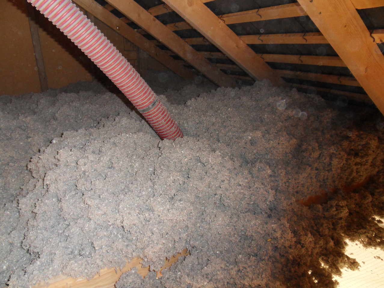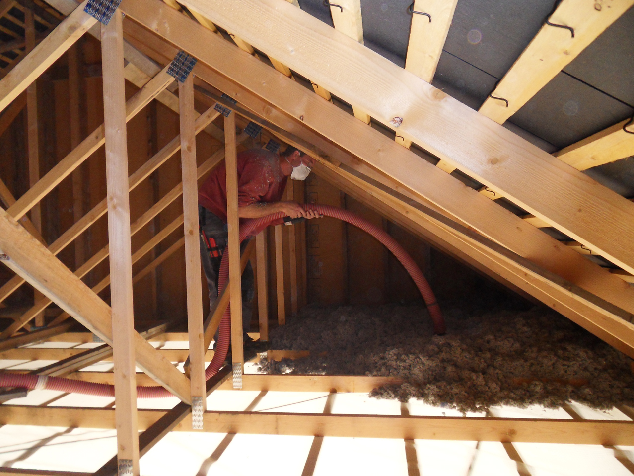 Isolation des combles perdus par soufflage de ouate de cellulose, matériau très performant, tant l’hiver que l’été.